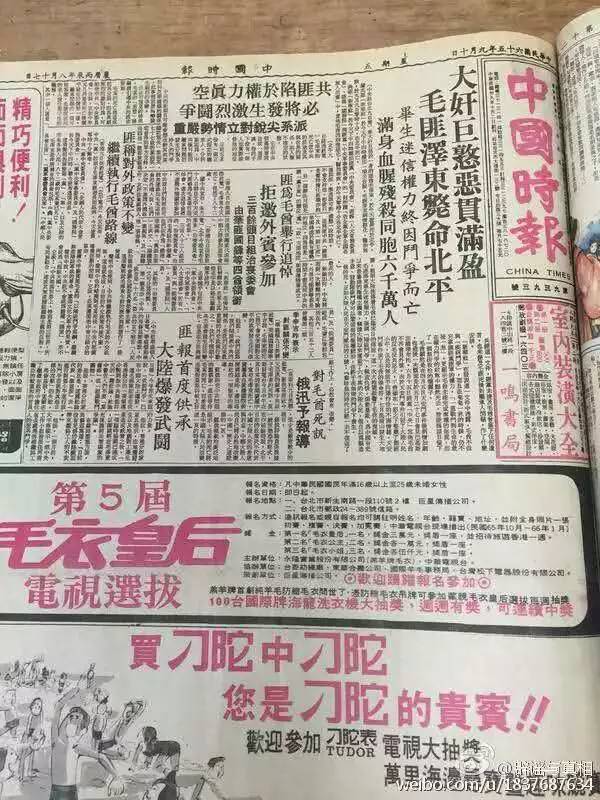 《中国日报》头版刊登新闻《大奸巨憝恶贯满盈,毛匪泽东毙命北平》